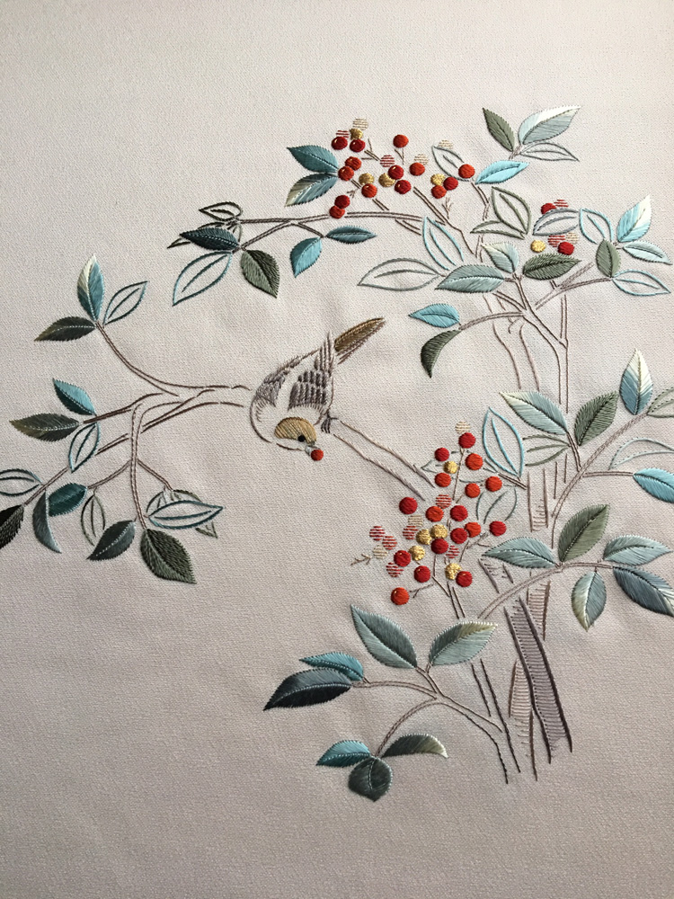 刺繍作品は名古屋帯「南天に小鳥」です。